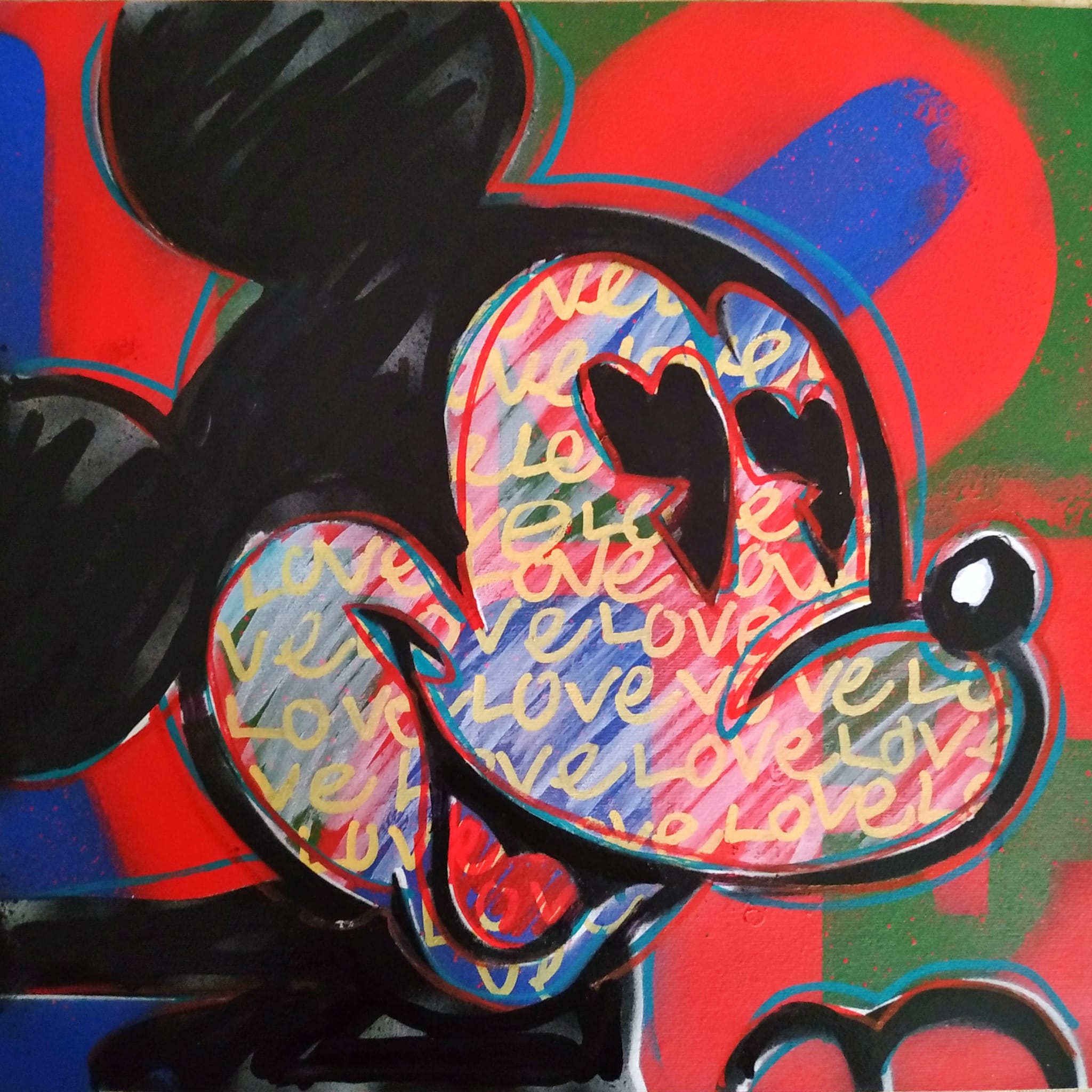TITLE: Love Mickey Red YEAR: 2020 TECHNICAL: Mixed (acrylics, inks…) SUPPORT: Paper Fedrigoni 220gr. SIZE: 32 x 32 cm.